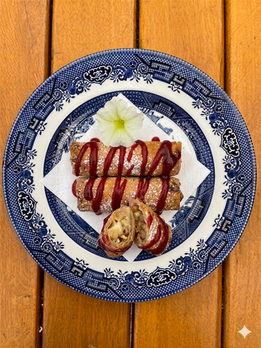 Gesuikerde banaan, chocolade dressing, bloemsuiker